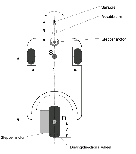 The mobile robot is built on the three-wheel chassis. Two front wheels serve only as a support and the third is used both for driving and steering. For this purpose are used stepper motors. On the footing is mounted movable arm, which is used as a carrier for necessary sensor equipment. Main mechanical parts of the mobile robot are depicted in Figure 1. In this figure is as S marked point of the rotation of the robot and as B the vertical centre line of the back wheel. The proportions of the robot are listed in Table 1.