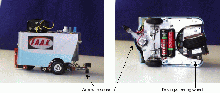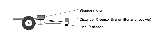 We used only one sensor for line detection and one for distance from obstacles measurement. Both sensors employ IR diodes or phototransistors. Whereas the sensor for line detection is made as the transmitter and receiver in one package, the sensor for distance measurement is formed from two separate optoelements. The placement of the sensors on the arm is shown in Figure 2 and two views on the robot are in Figure 3.