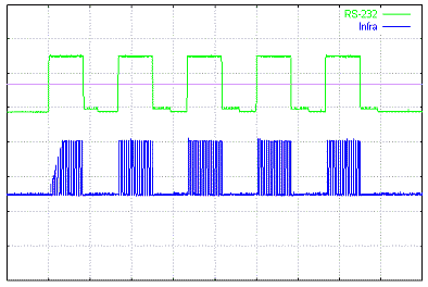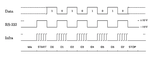 Pri vysielaní sa logickými úrovňami moduluje modulačná frekvencia 38 kHz. Pri bežnom vysielaní údajov cez RS-232 po doplnení štart- a stop-bitu vyzerá signál takto: